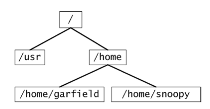 The Linux file system is organized as a tree. The root of the tree is simply labeled as /. A first level subdirectory of / is, for instance, /home or /user. The home directory contains all user directories, such as /home/garfield or /home/snoopy.